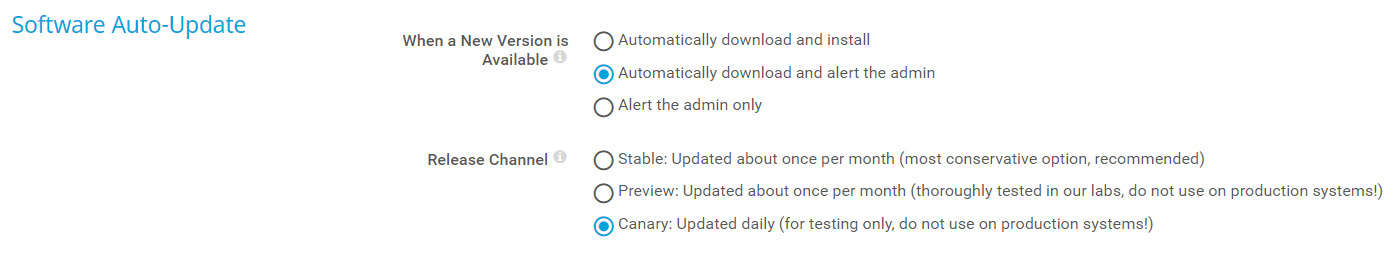 • Alert the admin only: Do not download updates. Only create a ToDo ticket. You can still manually download updates via the auto-update.