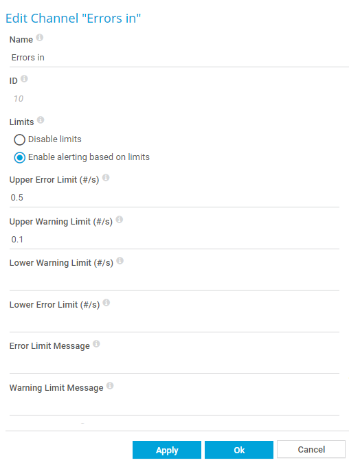 The following screenshot shows how to configure the limits for delta channels. You could set the following limits for the channel Errors In with a standard scanning interval of 60 seconds:
