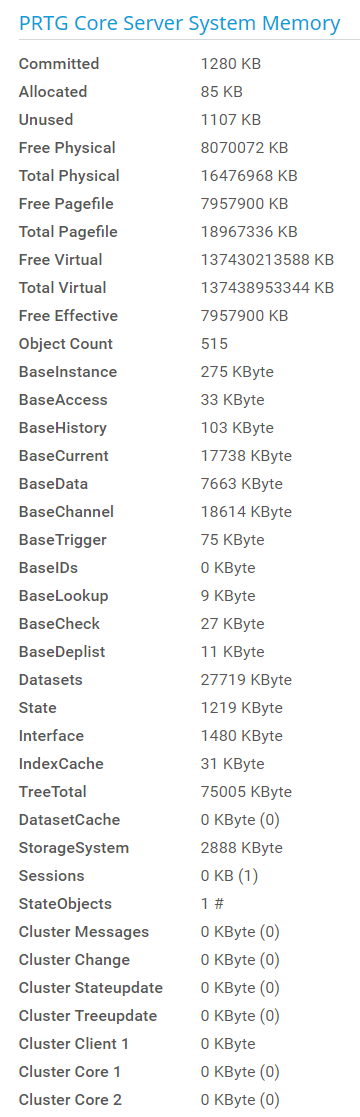 This section shows machine-oriented information regarding the memory usage of the PRTG core server system.