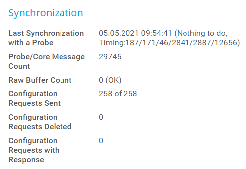 The PRTG core server holds the configuration of the entire monitoring setup and deploys it to the probes. This section shows statistics about the synchronization of the PRTG core server with the local probe and all connected remote probes (if any), since the last startup of the PRTG core server. All values are reset when the PRTG core server is restarted.